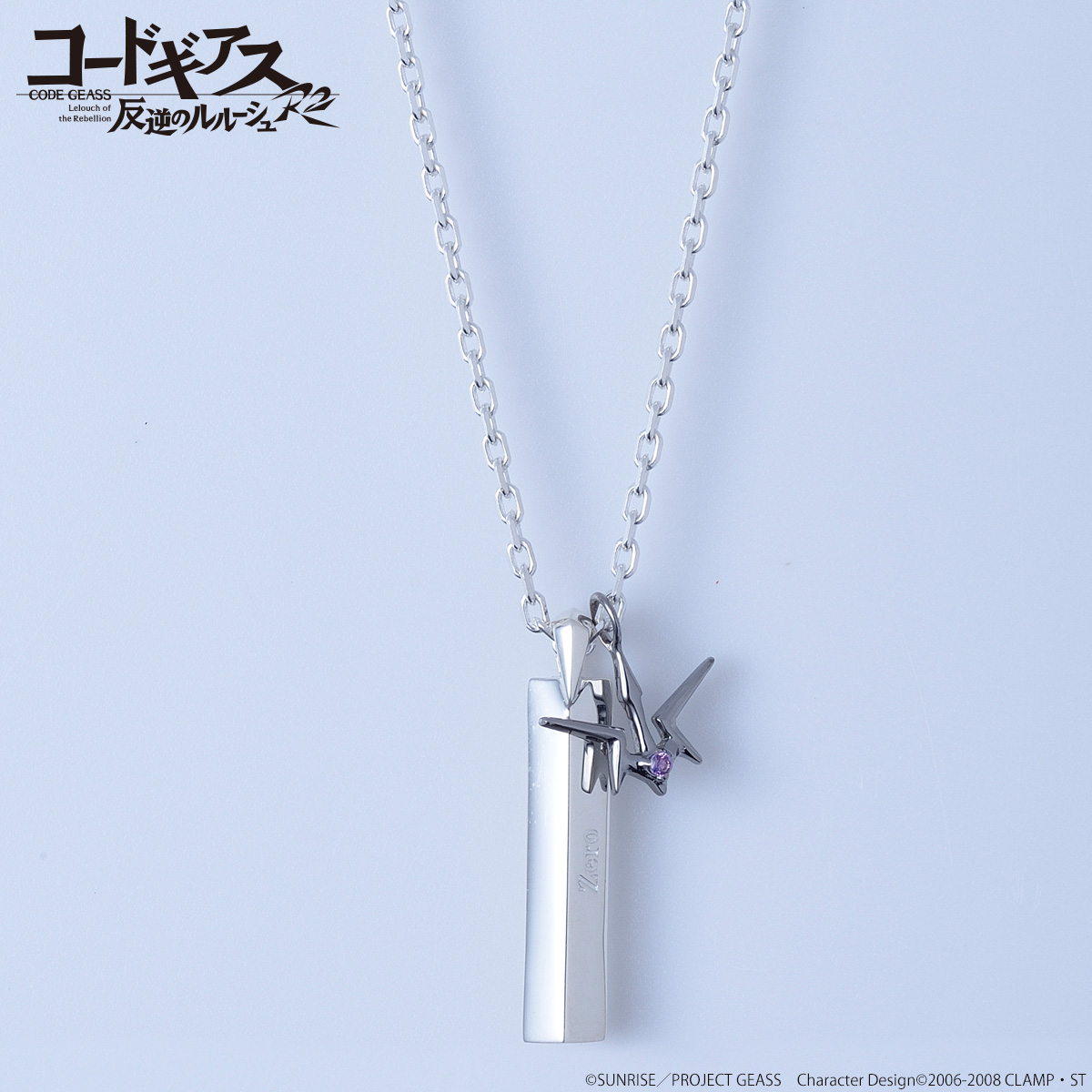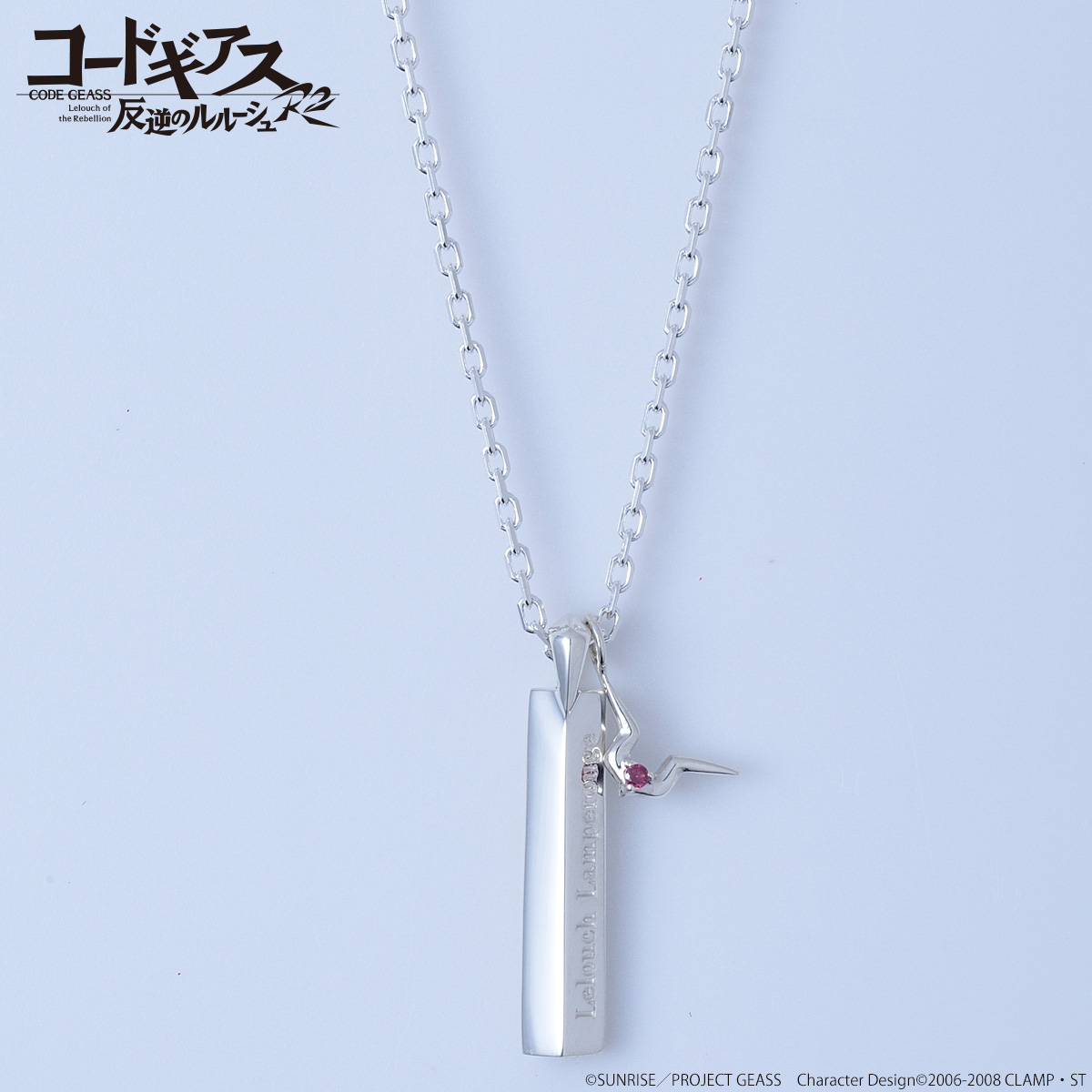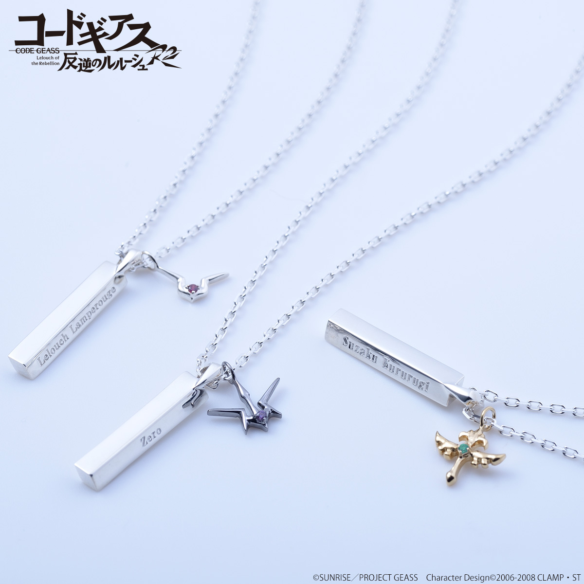シルバーネックレスはルルーシュ、スザク、ゼロの3種類。ペンダントトップには各キャラクター名前を刻印し、キャラクターと関係性のあるマークを忠実に再現したチャームが付属。小ぶりなチャームに各キャラクターをイメージしたカラーストーンが付いている。