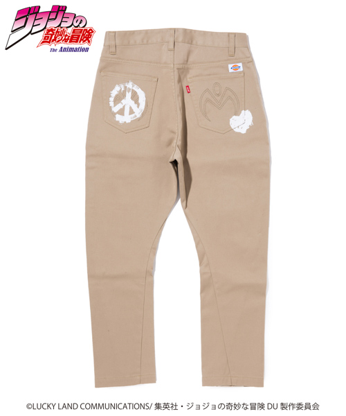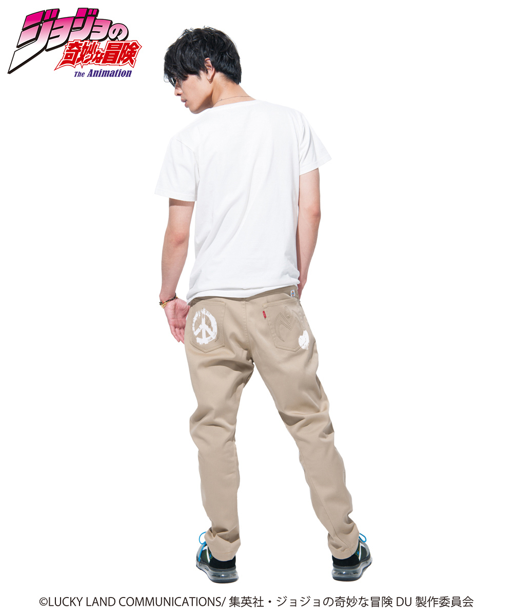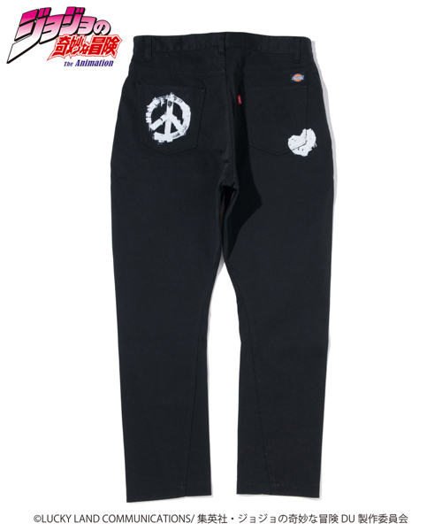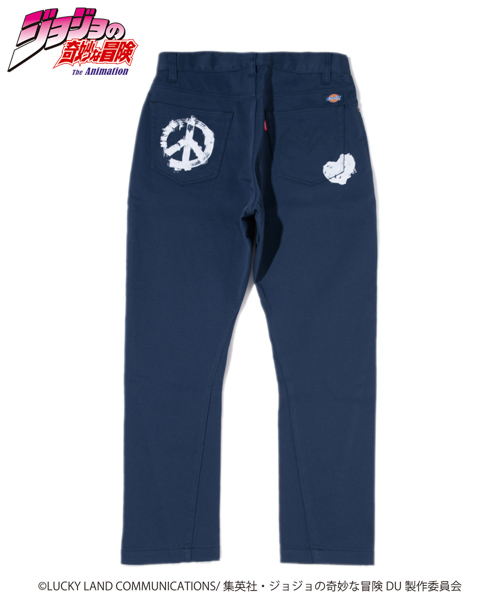 ディッキーズパンツはブラック、ベージュ、ネイビーの3カラーが展開される。右のバックポケットにはこの作品の舞台である“杜王町”のマークがステッチされ、仗助がアクセサリーとして身につけているハートやピースマークのプリントもポイントだ。