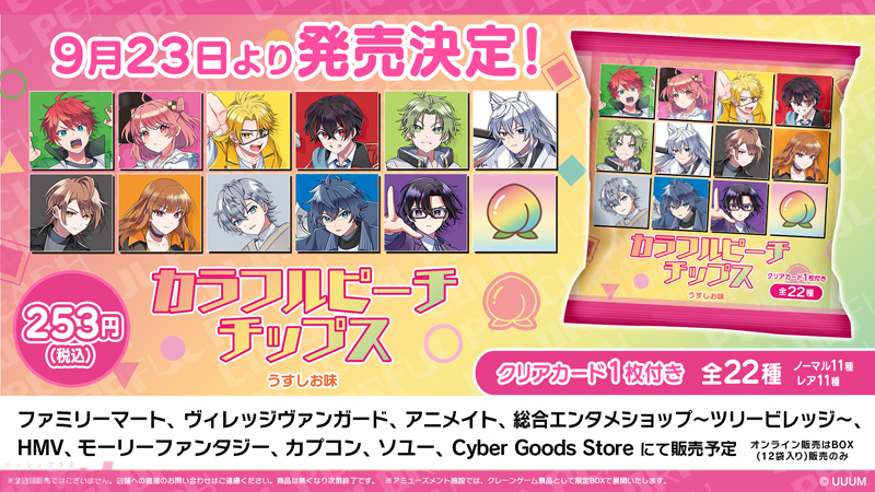 『カラフルピーチチップス うすしお味』では、ゲーム実況グループ「カラフルピーチ」の個性豊かなメンバーたちが描き下ろしイラストとなって登場。全22種類のオリジナルカードがランダムで1枚封入されています。