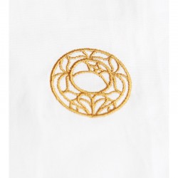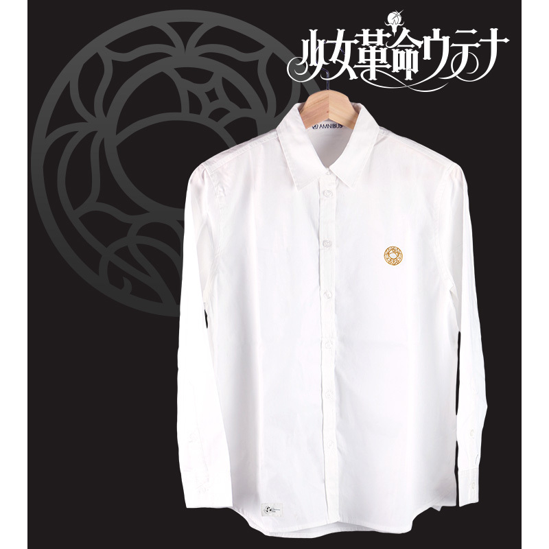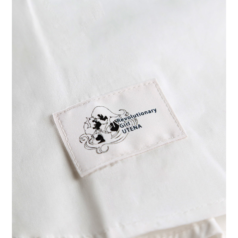 薔薇の紋章シャツは胸元に金糸で薔薇の刻印が刺繍され、裾にはさりげなくウテナとアンシーのシルエットが描かれたタグがあしらわれている。