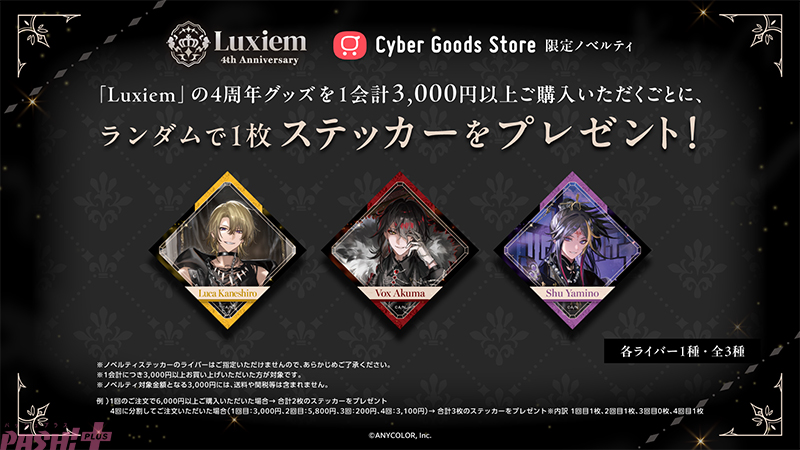 Cyber Goods Storeにて「Luxiem」4周年記念グッズを1会計3,000円以上ご購入いただくごとに、ランダムで1枚ステッカー(全3種)をプレゼントします。