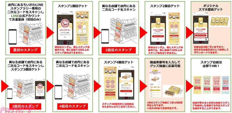 スタンプ2個でちいかわオリジナルデザインのスマホ壁紙がもれなくもらえます。スタンプ4個でちいかわオリジナルスタンプセットが当たる抽選に参加できます。1枚のスタンプ台紙につき1回応募可能となります。スタンプ台紙は全部で4枚あり、最大4回まで応募可能です。スタンプ台紙を1枚コンプリートすると、次の台紙に進めます。