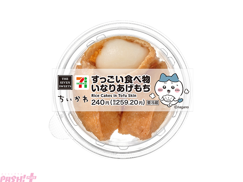 ハチワレがちいかわに「共有」したかった、すっごい食べ物の「いなりあげもち」をイメージした商品。コシのあるおもちを甘辛く煮た油揚げで包みました。