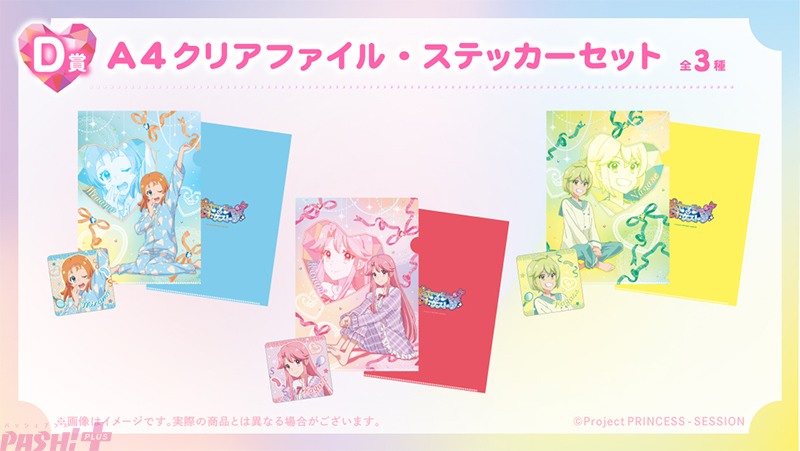 D賞:A4クリアファイル・ステッカーセット 全3種 サイズ:クリアファイル W220mm×H313mm程度/ステッカー W60mm×H60mm