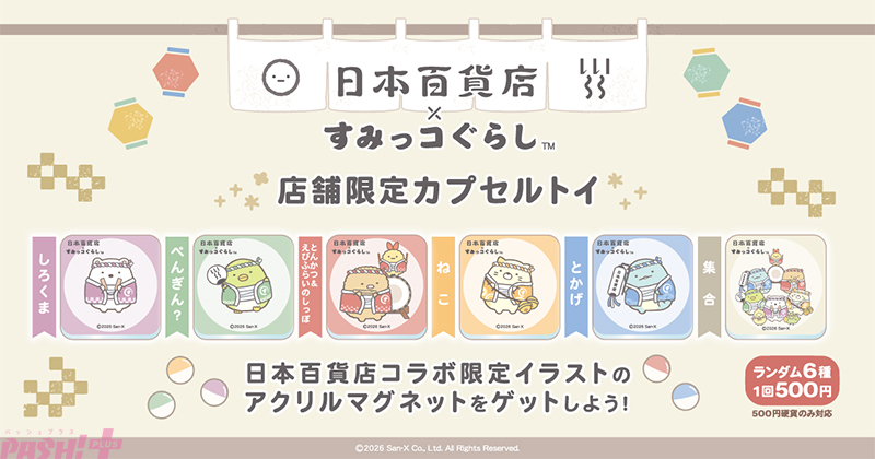 サンエックスは、「ニッポンの百貨をおもしろく。」をコンセプトに、日本全国のこだわりの食品や雑貨をセレクトし、販売する日本百貨店と、期間限定コラボ企画「日本百貨店×すみっコぐらし」と題して、日本百貨店店頭ですみっコぐらしコラボ商品が2026年1月9日(金)より販売されることを発表しました。
