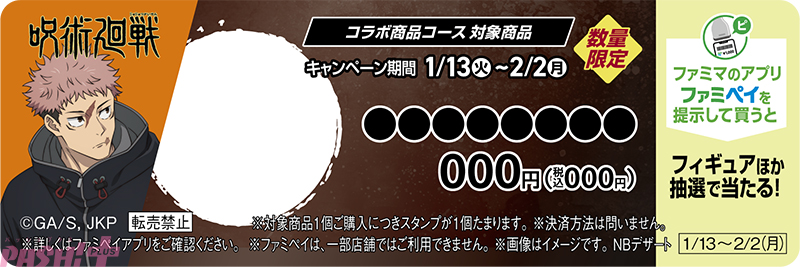 オリジナルグッズが当たる「ファミペイ」スタンプ企画が開催。期間中、「ファミペイ」を提示して、対象商品を購入すると、1商品につきスタンプが1個たまります。ためたスタンプ数に応じてお好みのコースに応募すると抽選で呪術廻戦グッズなどが、合計120名に当たります。