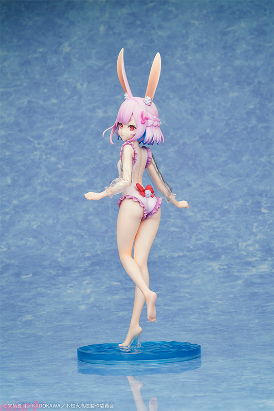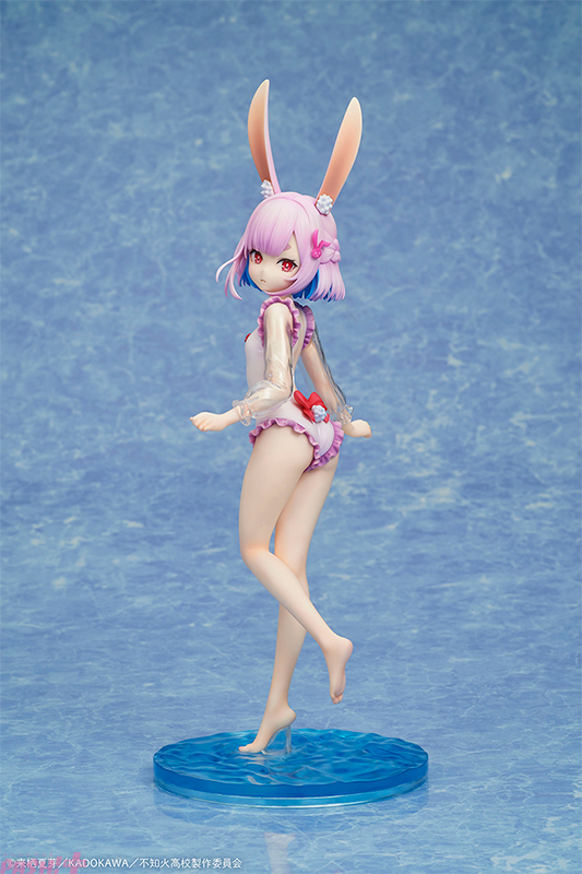 ふと振り返り、こちらを見つめる少しツンとした表情は、毒舌家な一面を感じさせつつも、どこか愛らしさも感じさせます。髪のインナーカラーや肌の質感など細部にまでこだわった彩色表現にも注目です。台座には水面をイメージしたクリアパーツを使用し、夏らしい爽やかな雰囲気を引き立てています。フリルが映えるワンピース水着姿の右左美 彗を、ぜひお手元でお楽しみください。
