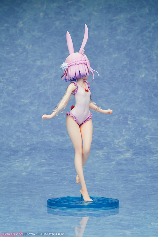 TVアニメ『人外教室の人間嫌い教師』より、右左美 彗が1/7スケールフィギュアになって登場です。作中でも印象的な白いフリルのワンピース水着を丁寧に立体化、清楚さと可憐さをあわせ持つ仕上がりです。袖にはクリア素材を使用し、やわらかな透け感を表現。軽やかで涼しげな雰囲気を演出しました。後ろのリボンが、後ろ姿をさりげなく彩ります。