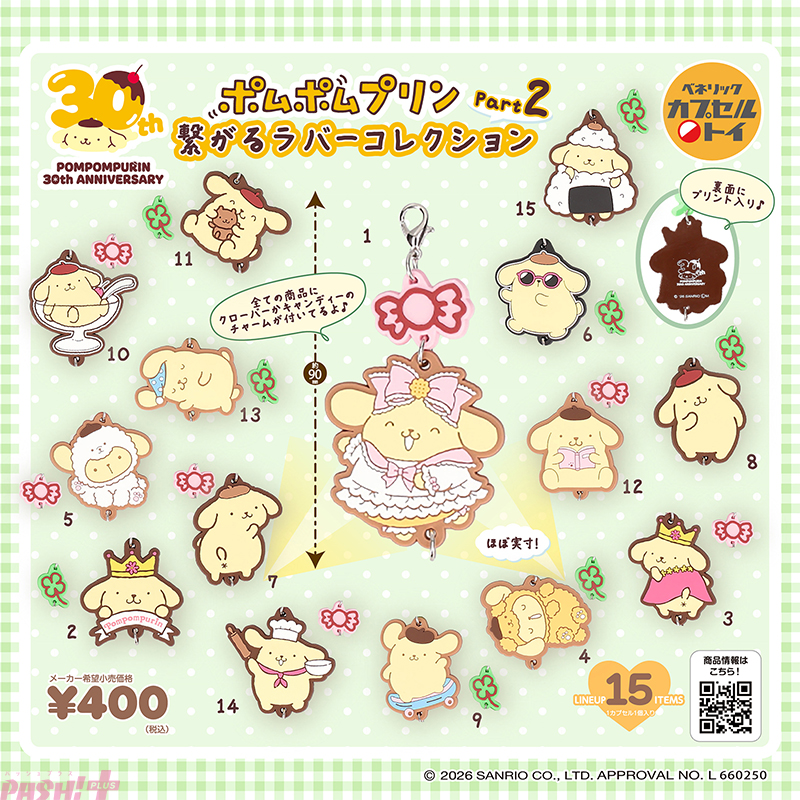 2026年にデビュー30周年を迎えたポムポムプリン。30周年にちなんで、Part1とPart2それぞれ15種ずつ、合わせて全30種のラバーコレクションが登場。コレクション心をくすぐるラインアップは、おっきなプリンのぬいぐるみにぎゅっと抱きつく姿の「プリンだってだきつきプリン」や、王冠を被ったポムポムプリンの復刻デザイン「マジカルプリン 2026」など、一部はアニバーサリーデザインです。