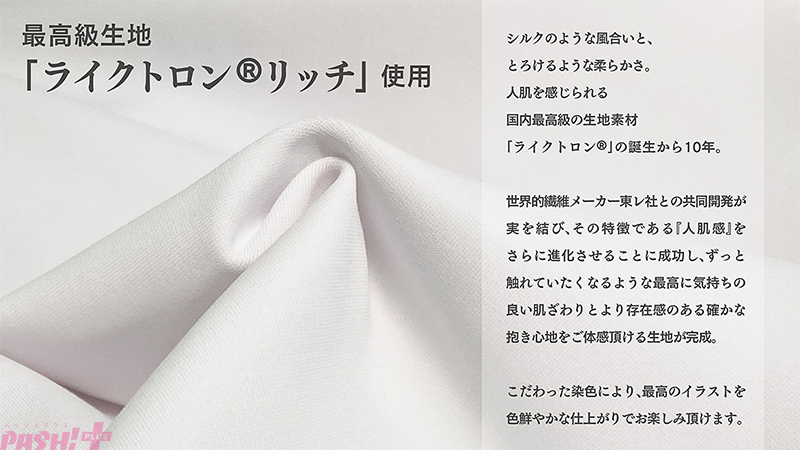 生地は「ライクトロンリッチ」(2way トリコット)を使用「きめ細やかさ」と「とろみのある感触」を追求した「ふんわり」「もっちり」とした感触、抱きしめたときには「ギュッと感」が得られる国内最高級の生地となります。