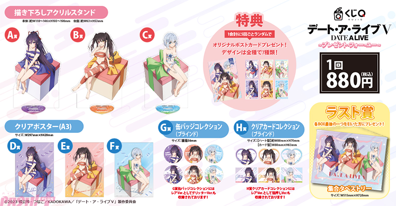 クオリティコンフィデンス(アニメイトグループ)は、新くじサービス「くじQ」にて、@TVアニメ デート・ア・ライブV ~プレゼント・フォー・ユー~』の店舗くじ・オンラインくじでの展開が決定しました。
