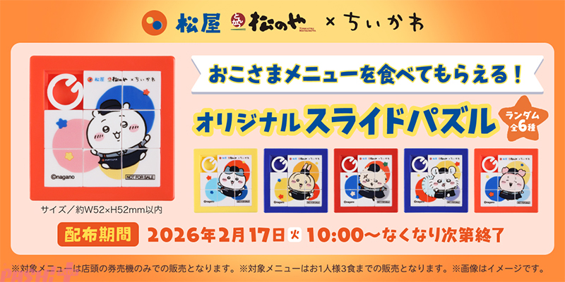 おこさまメニュー1品の注文につき、「松屋/松のや」×「ちいかわ」コラボ限定「オリジナルスライドパズル」(デザインは全6種類)を1枚、ランダムでプレゼントします。