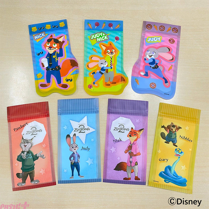 ゲイリーやパウバートなど、映画『ズートピア2』のキャラクターがいっぱい! 中身の見える窓つきのカラフルなジッパーバッグ8柄4枚セット。パウバートの兄姉・キャトリック&キティや、ニックの元相棒・フィニックのイラストも。