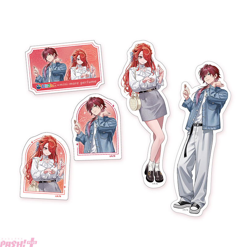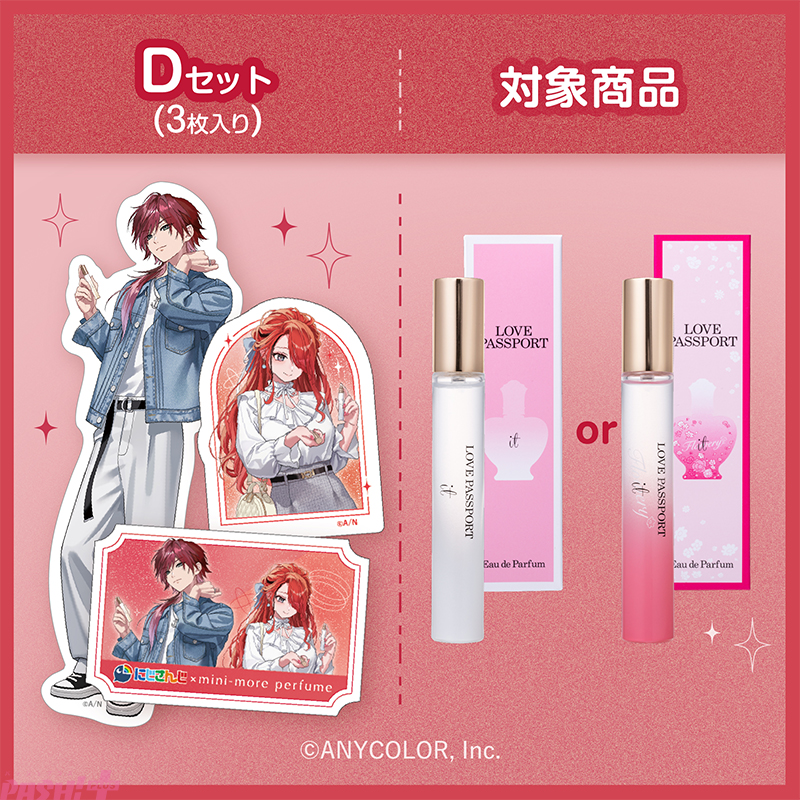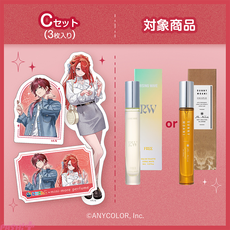 キャンペーン期間中、対象店舗(ミニモアパフューム対象製品の取り扱いのある全国の店舗、公式オンラインストア「FITS you.STORE」等)にて、3枚1組のコラボステッカーが封入された対象商品を発売します。ステッカーデザインは、「ローレン・イロアス(2種)」「レイン・パターソン(2種)」「2名集合(1種)」の全5種。対象製品ごとに、あらかじめ決まった組み合わせで3枚を封入しています。