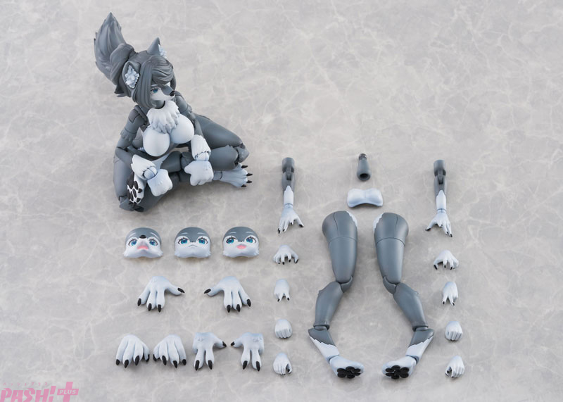 色分け成型、接着剤不要のスナップキットモデル。本体は「高ケモ」をメインとして、「中ケモ」に変更できるフェイス及び手足パーツが付属します。彩色済みフェイスも付属し、「高ケモ」仕様は「可動眼球」方式を採用。