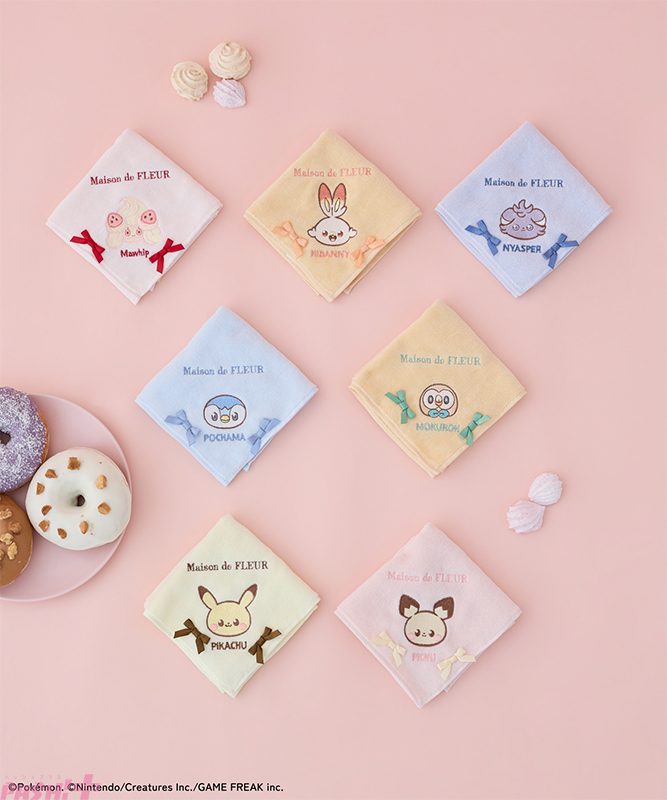 注目は、ツイード素材を使用した人気のフリルハンドルトートバッグ。フロントに、ピカチュウやポッチャマ、マホイップが首を傾ける愛らしい姿を刺繍であしらいました。各キャラクターに合わせて、カラーリボンを添えた同素材のラウンドポーチやタオルハンカチも用意しています。