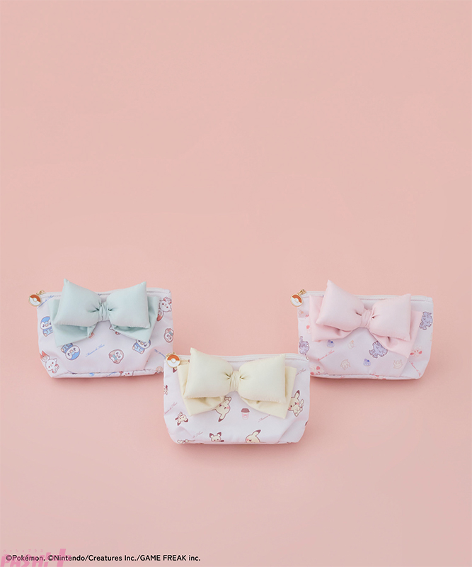 そのほか、艶やかなアセチ素材にポケモンをデザインしたチャームやぷっくりとしたリボンが目を惹く総柄プリントのポーチもラインアップ。チャームは、ピカチュウ、ピチュー、ポッチャマ、モクロー、ヒバニー、マホミル、マホイップ、ニャスパーの全8種を取り揃えました。バッグやポーチのファスナー引き手には、モンスターボールモチーフとMaison de FLEURのロゴを表裏それぞれに刻印し、細部にまでこだわりました。