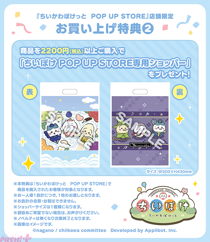 『ちいかわぽけっと POP UP STORE』にて、2,200円(税込)以上購入すると「ちいぽけ POP UP STORE専用ショッパー」をプレゼントします。