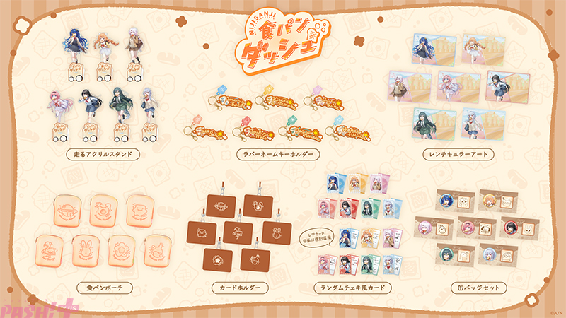 グッズラインナップは、走るアクリルスタンド、缶バッジセット、ランダムチェキ風カード、レンチキュラーアート、ラバーネームキーホルダー、食パンポーチ、カードホルダーの全7種類。