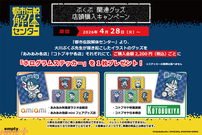 emptyは、集英社ゲームズから好評発売中の「Steam/Nintendo Switch/PlayStation5」用ソフト『都市伝説解体センター』より漫画家大川ぶくぶ先生描き起こしイラストのグッズを発売します。