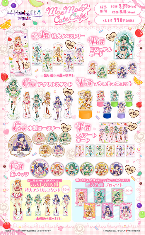 描き下ろしイラストが大きいサイズで楽しめる特大タペストリー、ビッグサイズのダイカットビジュアルボード、ペットボトルのフタに飾って楽しめるフタのるマスコットなど豪華グッズラインナップ満載。また、ラストWIN賞では約30cmの特大アクリルスタンドをラインナップ!