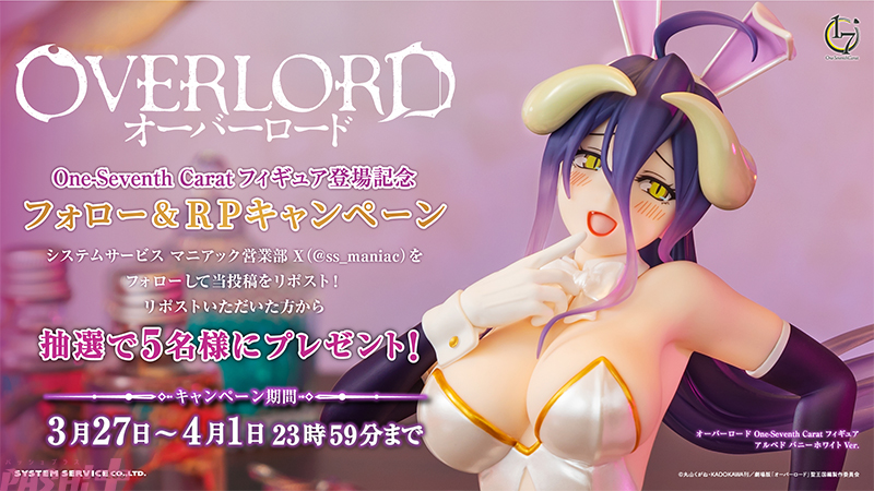 また、プライズ登場を記念したフォロー&リポストキャンペーンも実施。システムサービス公式X(旧Twitter)をフォローして、該当ポストをリポストした人の中から抽選で5名に4月登場の『オーバーロード One-Seventh Caratフィギュア アルベド バニーホワイトVer.』をプレゼント!
