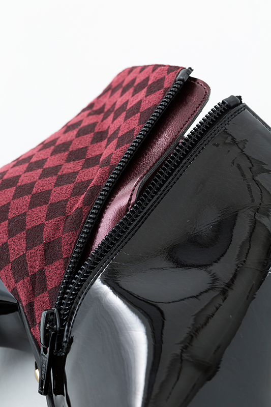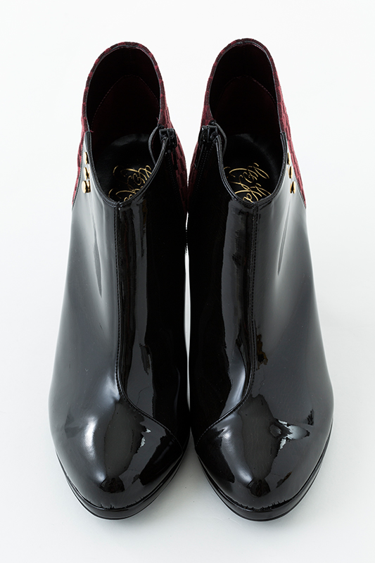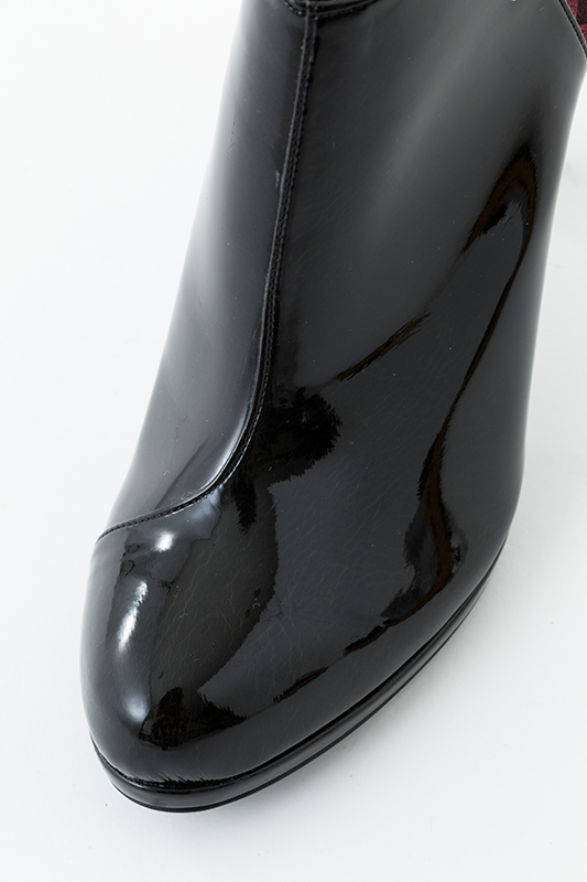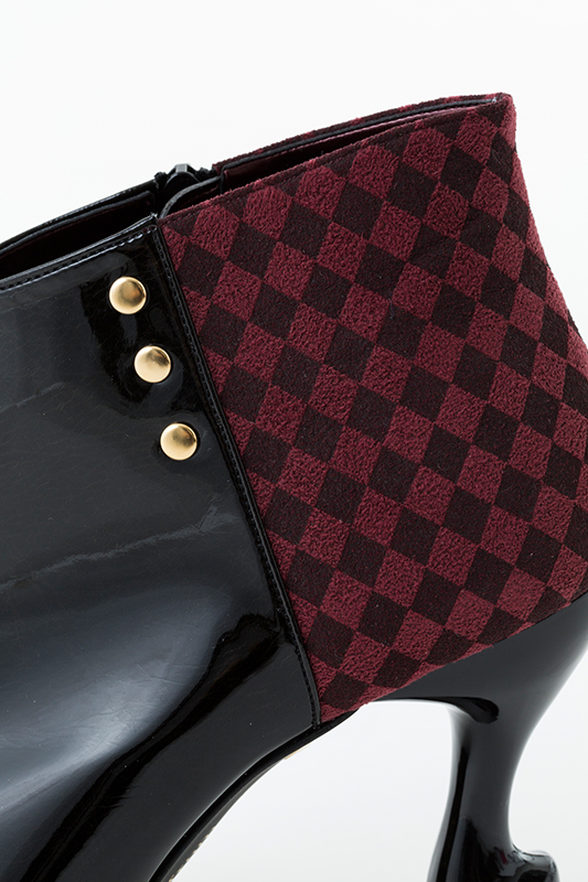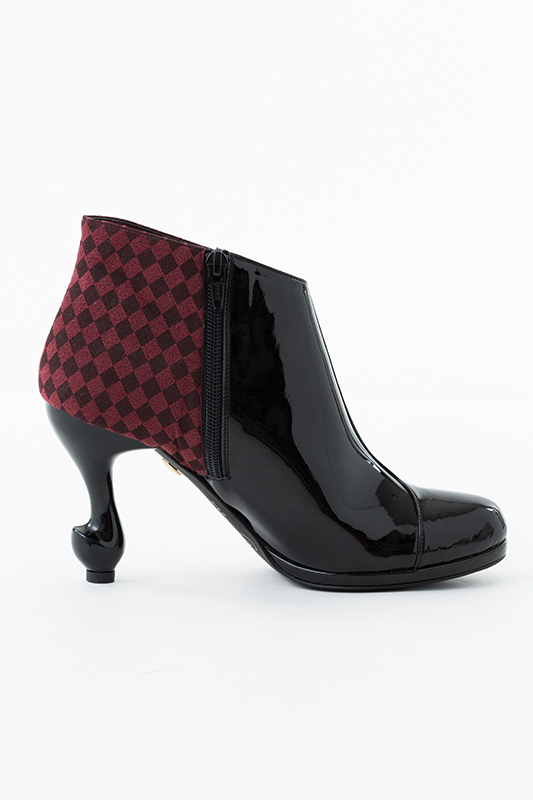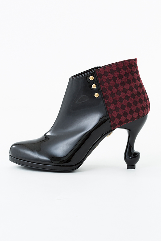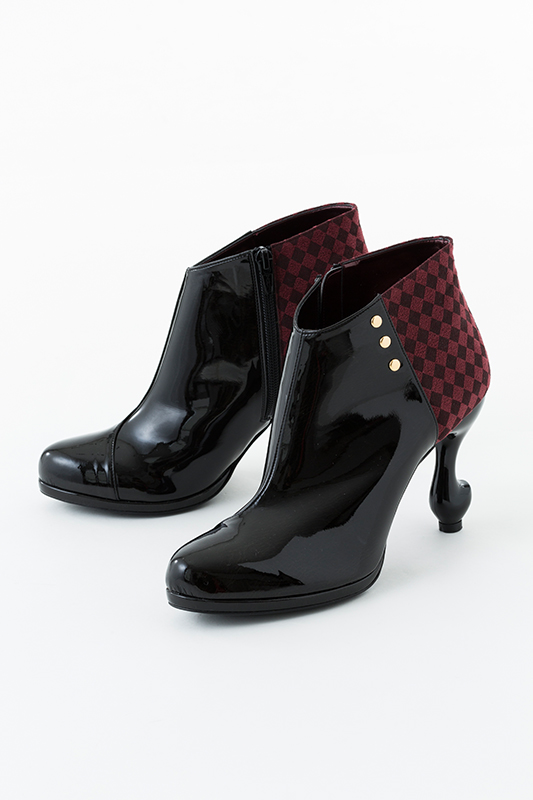 加州清光をイメージしたデザインのブーティです。本体の後部に使用している生地は加州のロングコートの裏地をイメージしたダイヤ柄。この靴のためだけにレーザー加工で柄を表現しています。金ボタンも加州のロングコートから落とし込んだデザイン! ブラックの本体にゴールドが映えています。