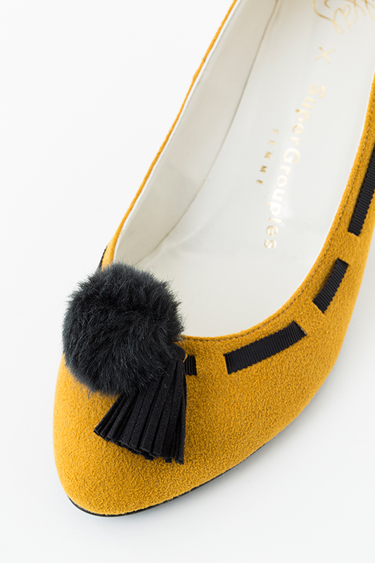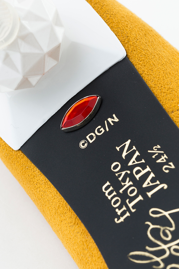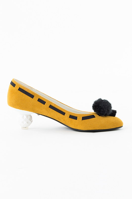 小狐丸の着物の装飾にあるようなブラックのポンポンやフリンジがアッパーに付いたデザイン。内側のデザインは小狐丸の髪色をイメージしたホワイト。本底には小狐丸の瞳をイメージしたビジューが! 普段は見えないようなところにもこだわっているデザインが嬉しい! 本体にぐるりと装飾されたブラックのリボンが上品な印象を与えてくれます。
