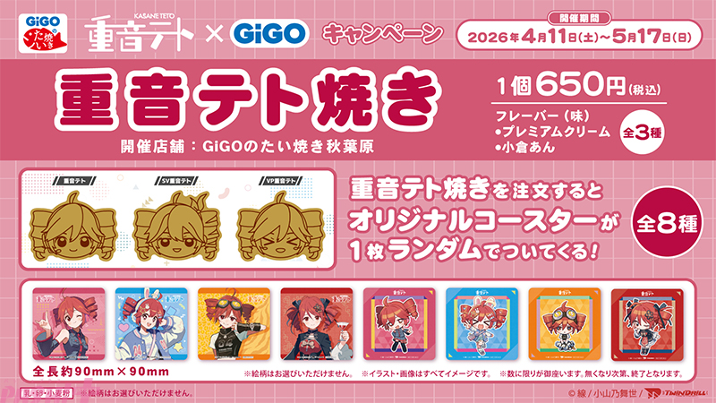 【重音テト誕生祭2026】エイプリルフールだけど嘘じゃない!? かわいいアクリルスタンドや「重音テト焼き」が登場の「重音テト×GiGOキャンペーン」が開催