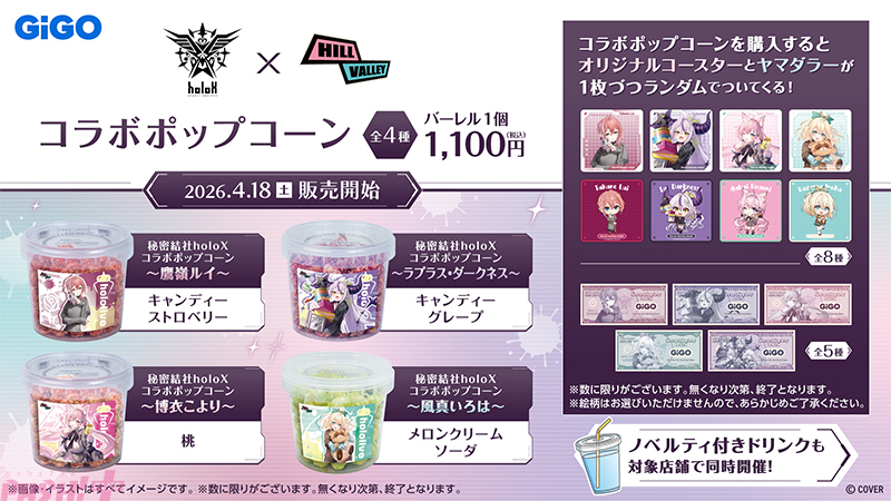 一部店舗にて、「秘密結社holoX」とグルメポップコーン専門店HillValley(ヒルバレー)とのコラボポップコーンおよび、「holoX焼き」1点ご購入につき、ノベルティコースター(全8種)+ヤマダラー(全5種)をランダムで各1枚進呈します。