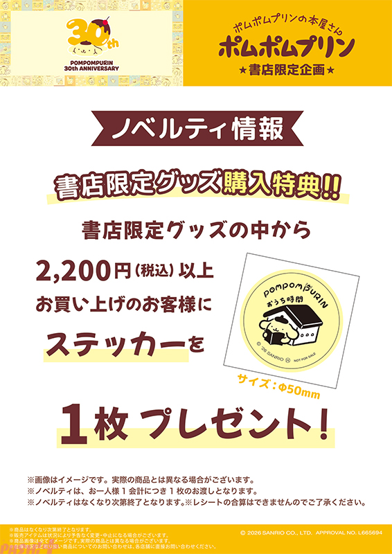 さらに税込2,200円以上のお買い上げで、限定ノベルティステッカーをプレゼントします。ポムポムプリンの30周年を記念した書店限定グッズを、お近くのお店でぜひお手に取ってご覧ください。