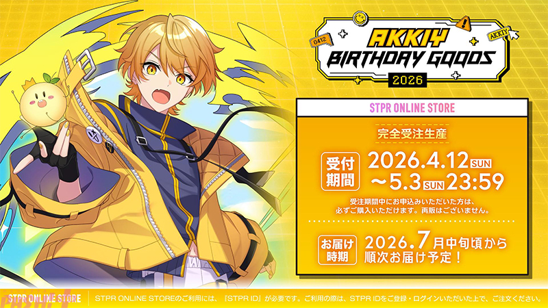 STPR所属の超多才2.5次元歌い手グループ「AMPTAKxCOLORS」(読み:アンプタックカラーズ/通称:AMPTAK)メンバー「あっきぃ」の誕生日(4月12日)を記念した「あっきぃ BIRTHDAY GOODS 2026」がSTPR ONLINE STOREにて販売中です。