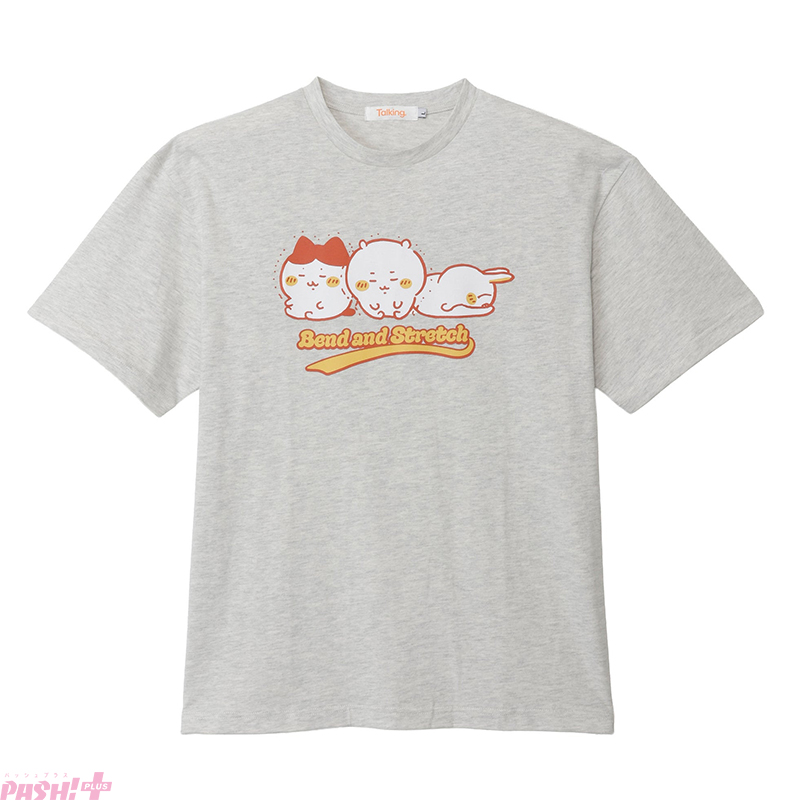 入念にストレッチする姿が愛らしい! ぷるぷる頑張るちいかわとハチワレに、余裕綽々なうさぎ。やさしいカラーリングでカジュアルコーデに取り入れやすいデザインです。