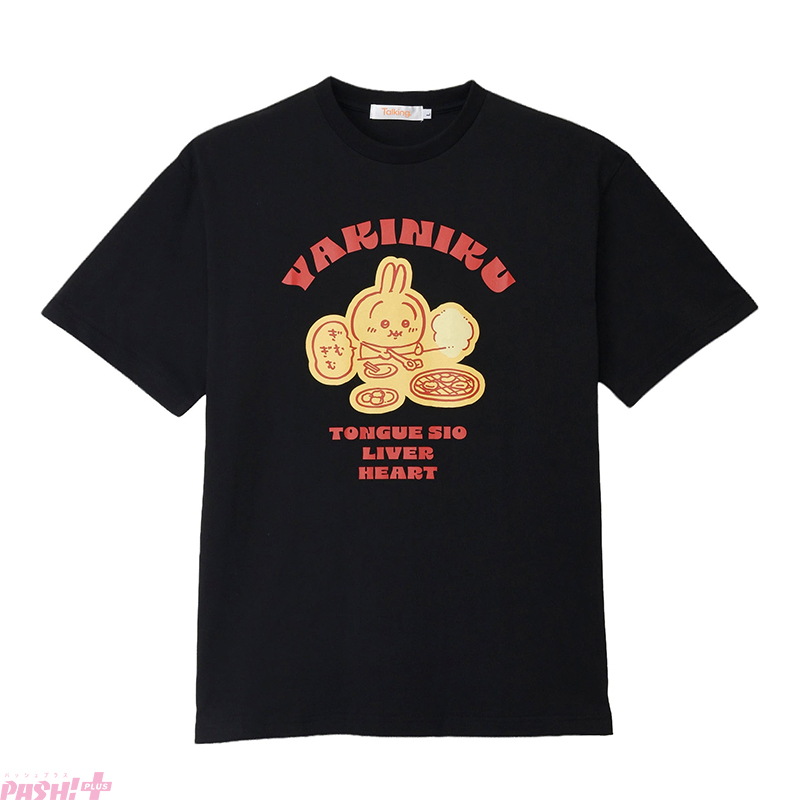 夏が近づくと食べたくなる焼肉。タン塩、レバー、ハァ~?。ぎむぎむと焼肉を嗜むうさぎと注文メニュー。焼肉の油が飛んでも安心なブラックのボディとレトロカラーのプリントがポイントです。