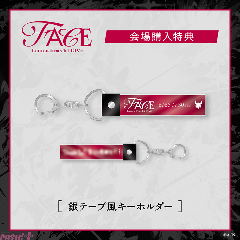 「ローレン・イロアス 1st LIVE “FACE”」会場内オフィシャルグッズ販売ブースで税込5,000円以上ご購入いただいたお客様に「銀テープ風キーホルダー(全1種)」を1点プレゼントいたします。