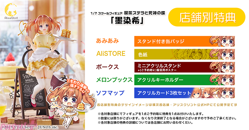 ゆずソフトがおくる大人気ゲーム『喫茶ステラと死神の蝶』より、明るく素直で優しい、幼馴染の女の子「墨染希」を、こもわた遙華先生によるポーズデザインをもとにフィギュア化いたしました。