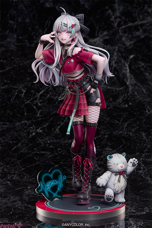 黒の水玉柄のリボンや、アクセサリーの精密感や金属感、さらに、網タイツ越しに表現された柔らかな太ももの質感や、編み上げブーツのディテールまで丁寧に再現され見どころ満載! 台座には石神のぞみのサインを模したプレートも付属します。