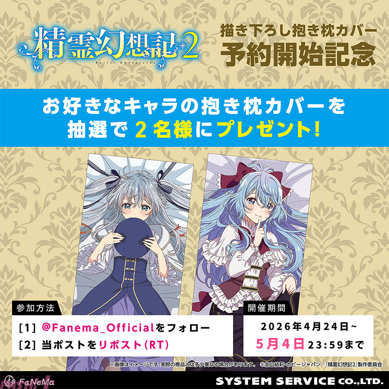 システムサービスは、アニメ・マンガ・ゲーム作品等のキャラクター商品の企画・製作・販売をする自社ECサイト「FaNeMa」にて、TVアニメ『精霊幻想記2』より「抱き枕カバー」「ミニミニ抱き枕」「BIGアクリルスタンド」を発売します。