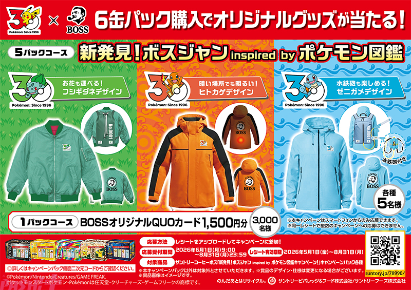 サントリービバレッジ&フードは、サントリーコーヒー「BOSS」と「ポケモン30周年」がタイアップした、フシギダネ・ヒトカゲ・ゼニガメからインスパイアされたボスジャン「新発見!ボスジャン inspired by ポケモン図鑑」などが当たるキャンペーンを6月1日(月)から実施します。
