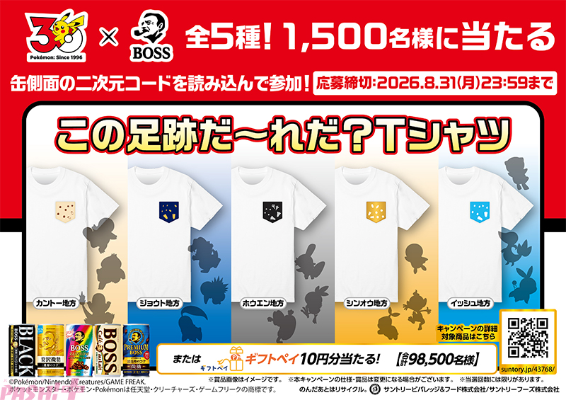 「BOSS」対象商品の2次元コードから応募でき、「この足跡だ~れだ? Tシャツ(全5種)」や「ギフトペイポイント」が当たるキャンペーンを実施します。