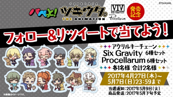 『パペっと!『ツキウタ。 THE ANIMATION』 Six Gravity Ver. / Procellarum Ver.』の発売を記念して、商品ラインナップの中からアクリルキーチェーン6種セットを各1名(合計2名)に当たるリツイートキャンペーンが2017年5月7日(日)23:59まで実施中だ。