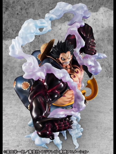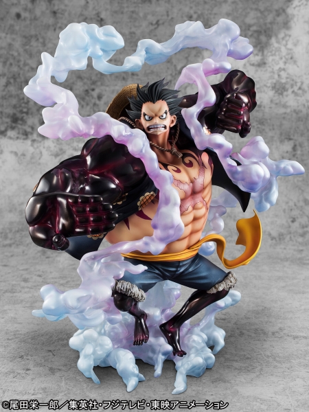 そんなギア4“弾む男”を発動したルフィを、作中初披露時の金剛力士像を彷彿とさせるポーズ・表情で再現。巨大化した両腕・胴体や“武装色の覇気”で黒く硬化した四肢は、原型製作のMAS(ピンポイント)・彩色見本製作のアンドウケンジによりハイクオリティな造形と彩色によって表現されている。