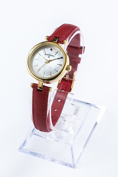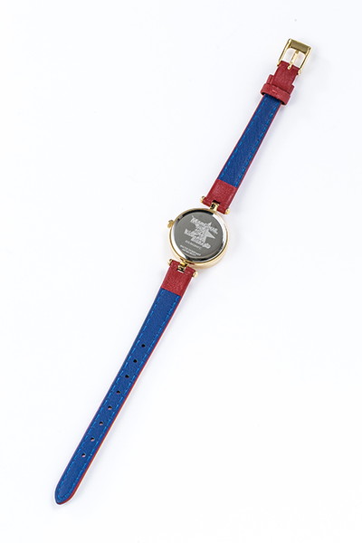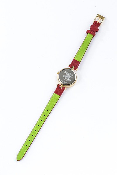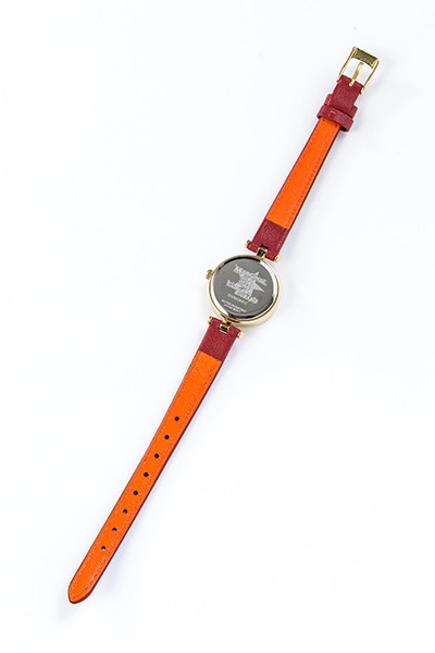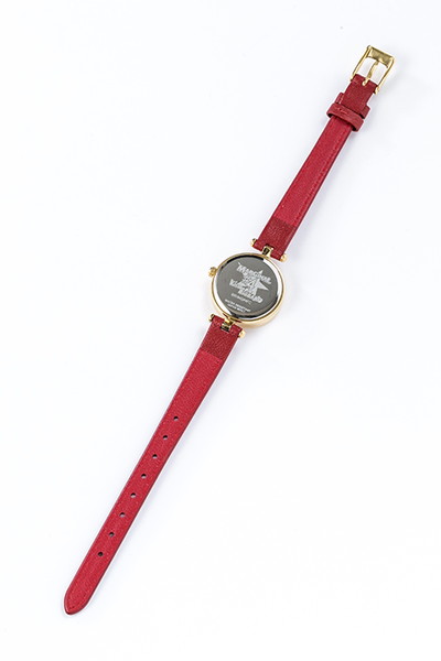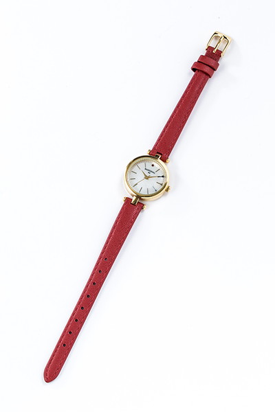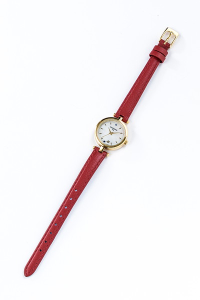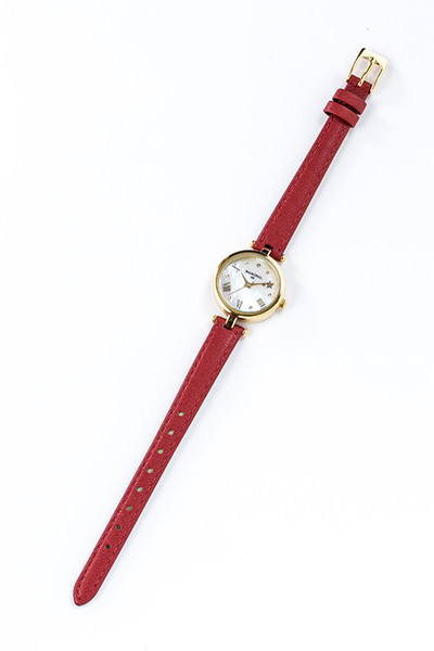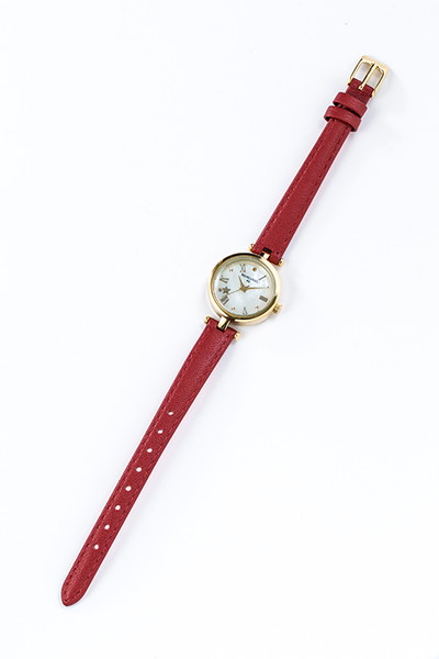 ゴールドベースの小振りなケースとホワイトシェルの文字盤がとってもキュートな腕時計。12時のインデックスとベルトの裏地は、各メンバーをイメージしたカラーリングが落し込まれている。文字盤にも、衣装のモチーフが装飾としてあしらわれている。ボルドーのベルトが映える上品な腕時計は、シーンを選ばずに使える逸品だ。