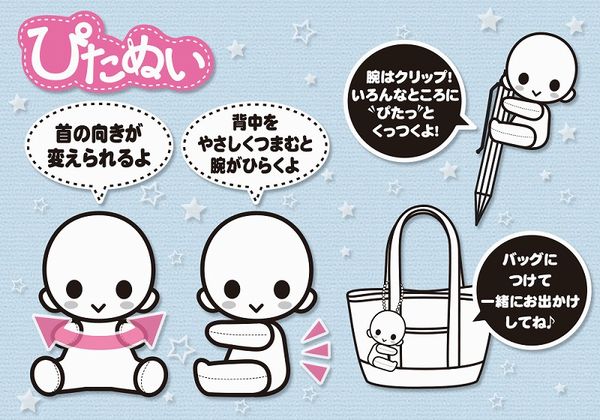 『ぴたぬい』は、ぎゅっとはさんで“ぴたっ”と寄り添うぬいぐるみマスコット。背中をつまむと腕がひらいて、いろいろなものに抱き付くかわいらしいぬいぐるみだ。ラインナップは、三日月宗近、小狐丸、加州清光、大和守安定の4種。