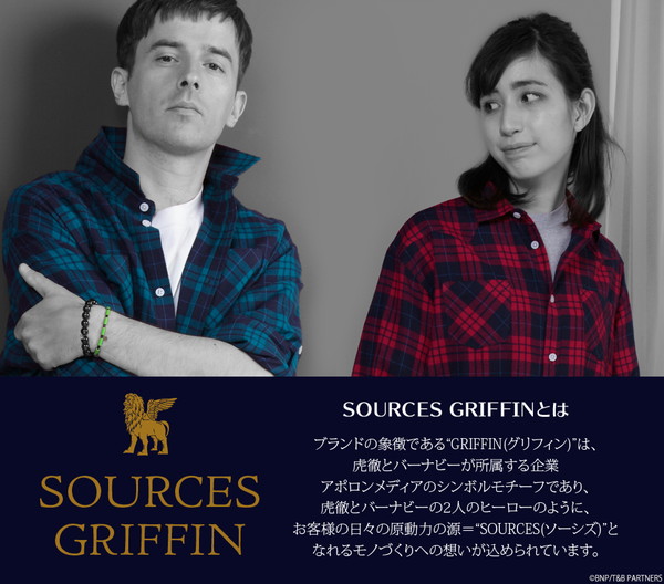 ブランドの象徴である“GRIFFIN(グリフィン)”は、虎徹とバーナビーが所属する企業・アポロンメディアのシンボルモチーフであり、虎徹とバーナビーの2人のヒーローのように、購入者の日々の原動力の源=“SOURCES(ソーシズ)”となれるモノづくりへの想いが込められているとのこと。