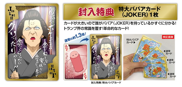 S(シリアス)シーンが27枚、M(マッド)シーンが27枚収録。予備カードはパクヤサが2枚となっている。さらに封入特典として、通常比1.3倍の“特大ババアカード(つまりJOKER)”1枚がもれなく付属する。誰がJOKERを持っているかが一目でわかる、斬新な遊び方を楽しめる。