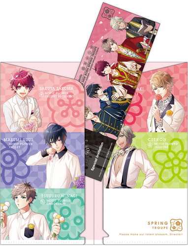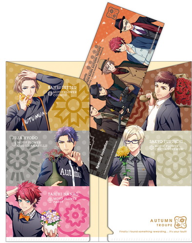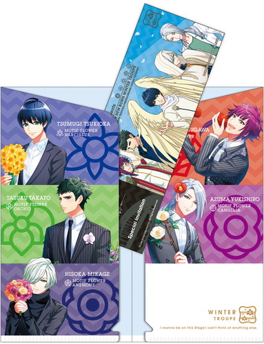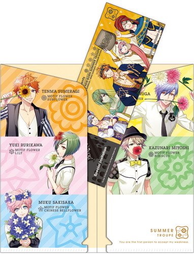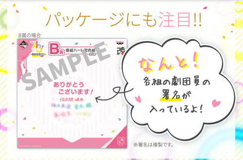 B賞~E賞では、各組の劇団員たちを描いた、ハート形のサインプリント入り色紙がラインナップ。それぞれ旗揚げ公演時の衣装姿が描かれている。F賞には、劇団員たちをデザインしたチケットファイルが登場。中には、旗揚げ公演のチケットをイメージしたカードが入っている。G賞には、劇団員全員をデフォルメデザインで描きおこしたラバーマスコットだ。