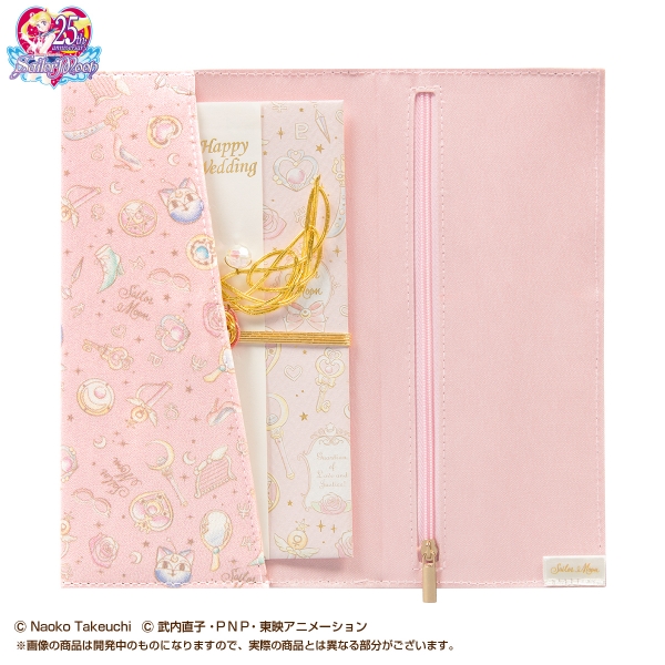 開閉しやすくかさ張らずに持ち運べるよう、マグネットボタンが内蔵されており、裏側には、封書ごと入る大きめのポケットが付き、招待状などを収納することも可能。また、セーラームーンに登場するアイテムをモチーフとしたご祝儀袋の水引は日本の水引職人によってデザインされたものでひとつひとつ手作りで作られている。