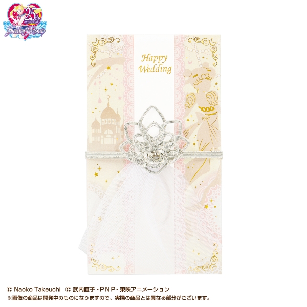 “ルナ&アルテミス”とセーラー戦士のアイテムをモチーフにした“アイコン”でデザインされたもの。ご祝儀袋は月とムーンスティックをイメージした豪華な水引飾り付きとなっている。