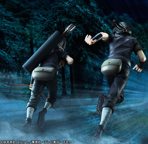 大猪を狩るための弓矢を持ち笑顔で走る全長約110mmのサスケと、振り向きながら少し前を行く全長約150mmのイタチの2人。付属の専用台座にセットすることで、“兄を慕う弟”と“弟を見守る兄”のあたたかな雰囲気をより楽しむことができる。